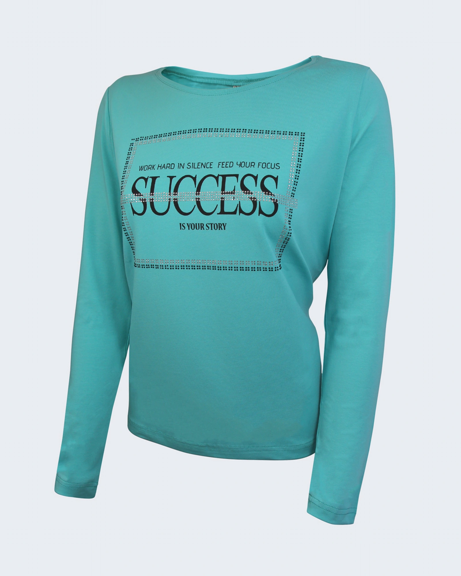 Дамска блуза с дълъг ръкав: – Лека и приятна материя – Стилен принт с декоративни камъчета – Обло деколте – Свободен силует – Произведено в България