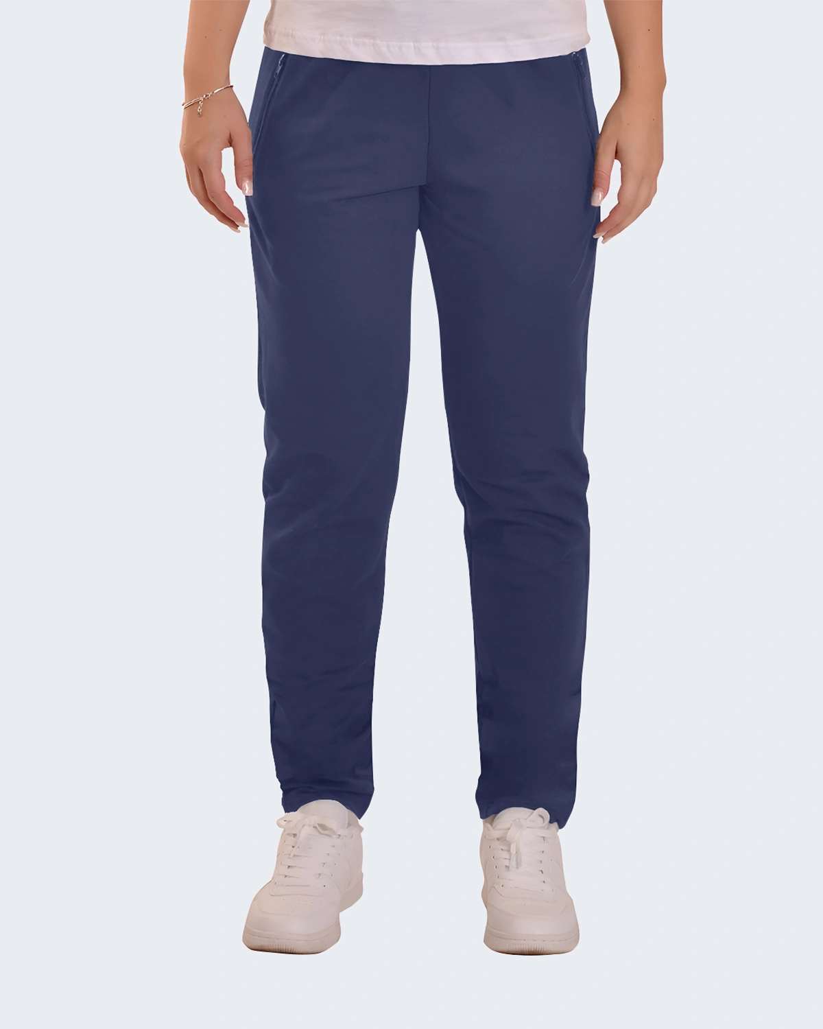 Дамско спортно долнище, подходящо за тренировка, свободно време и активно ежедневие – Лека и приятна материя – Широка кройка – Два странични джоба с цип – Колан с ластик и връзка – Произведено в България