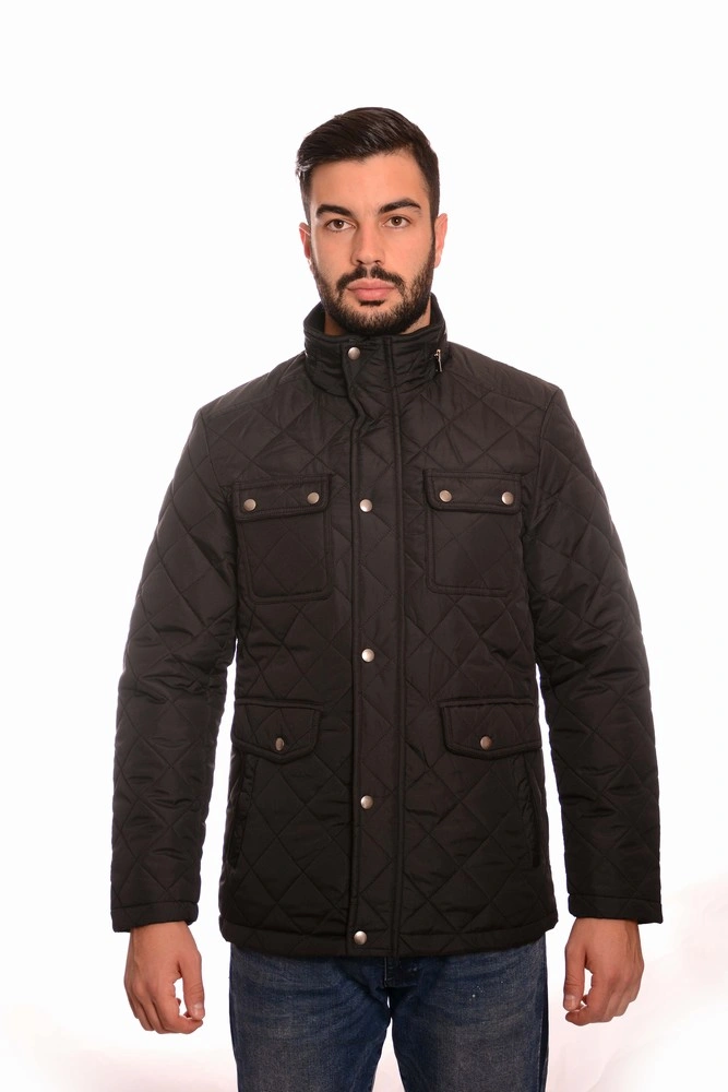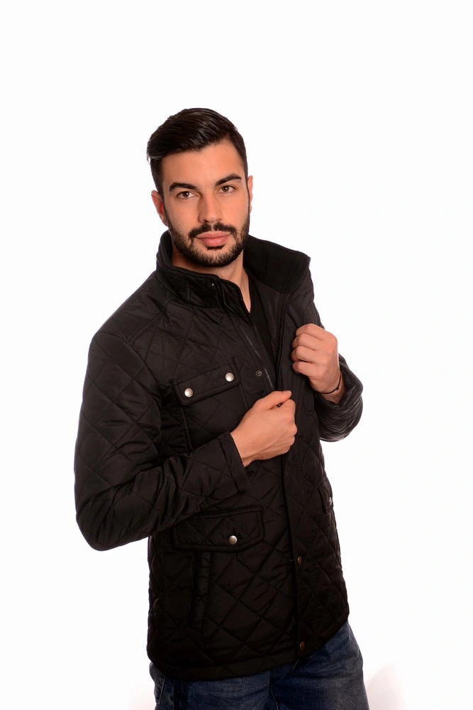 Мъжко яке с висока яка: – Плътна материя, подходяща за Есенно-Зимния сезон – Вталена кройка – Декоративен цип на яката – Странични джобове с копчета – Закопчаване отпред с цип и копчета